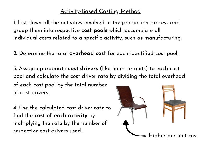 By using activity-based costing, the company can more accurately determine the cost of each chair and make more informed decisions about pricing, production, and profitability.