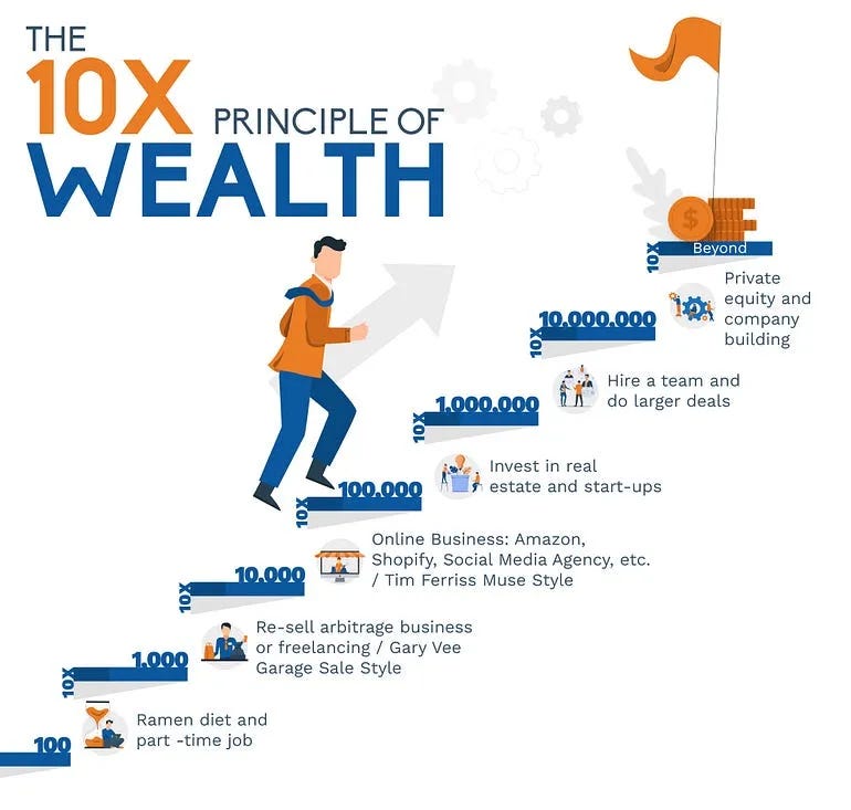 This approach mirrors the 10x Wealth Principle, where each milestone multiplies the next goal. The 10x wealth principle is a concrete example of thinking in orders of magnitude